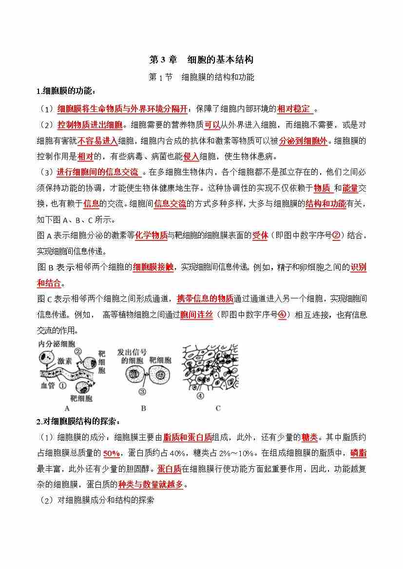 第3章 细胞的基本结构(知识清单)(答案版)
