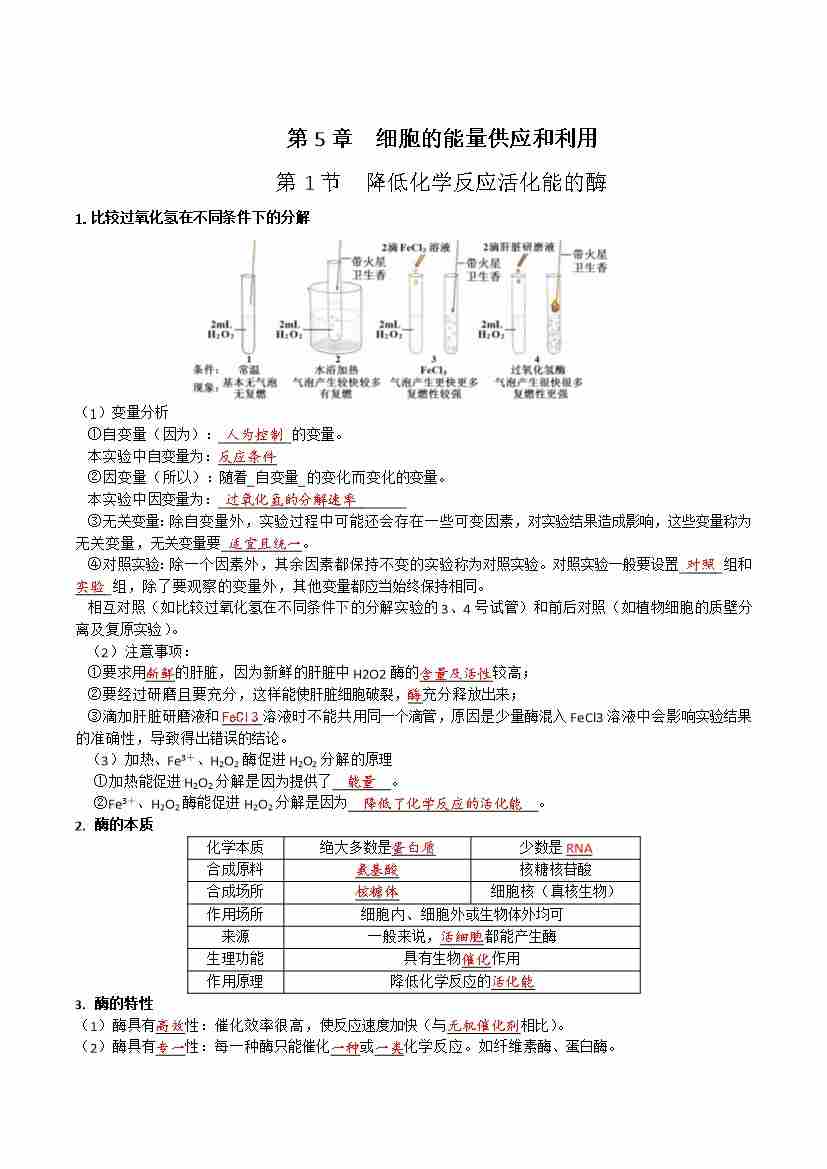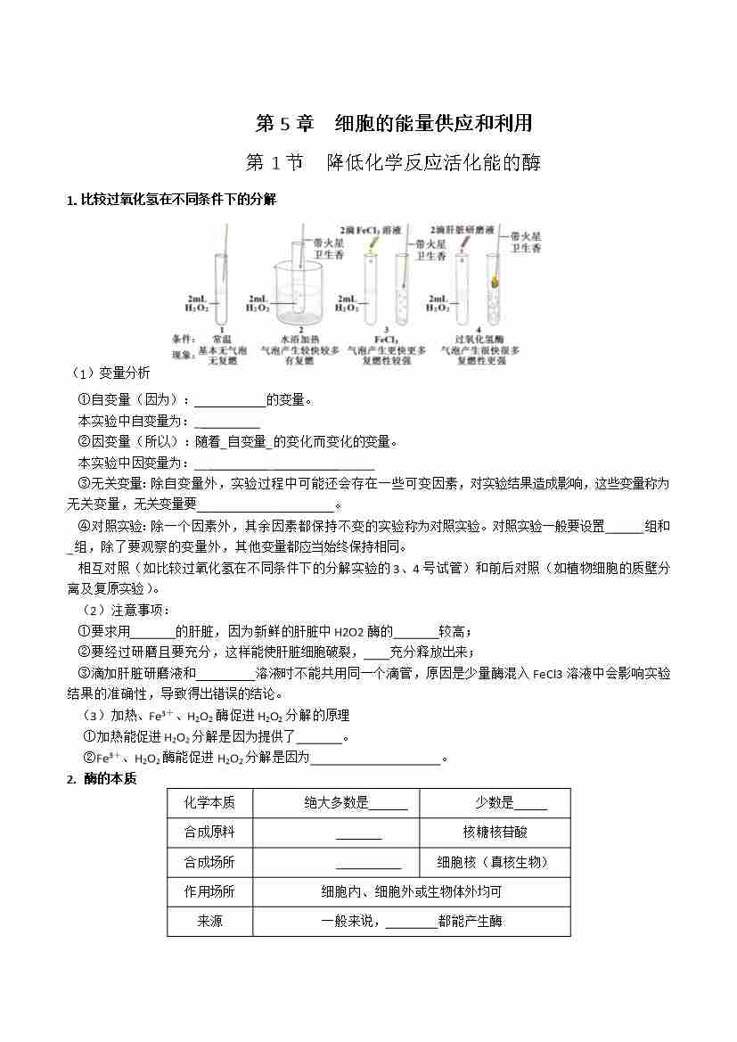 第5章 细胞的能量供应和利用(单元知识清单)(填空版)