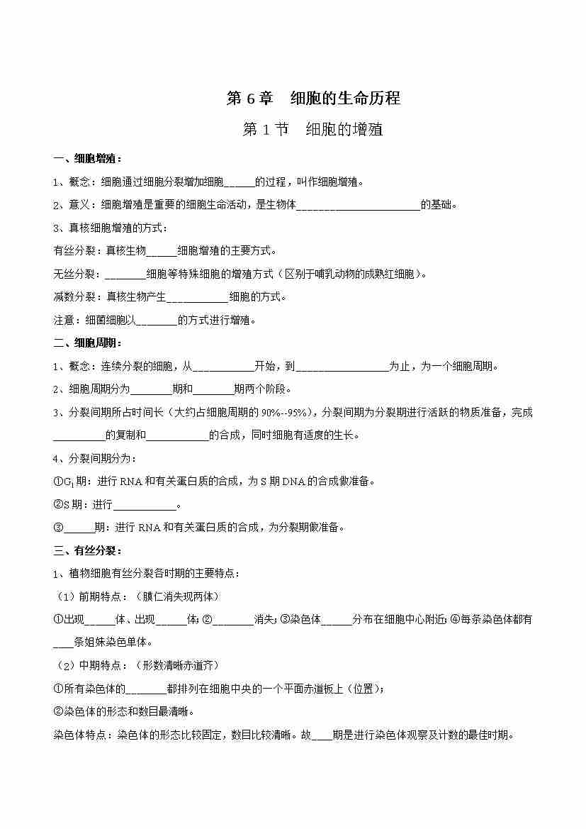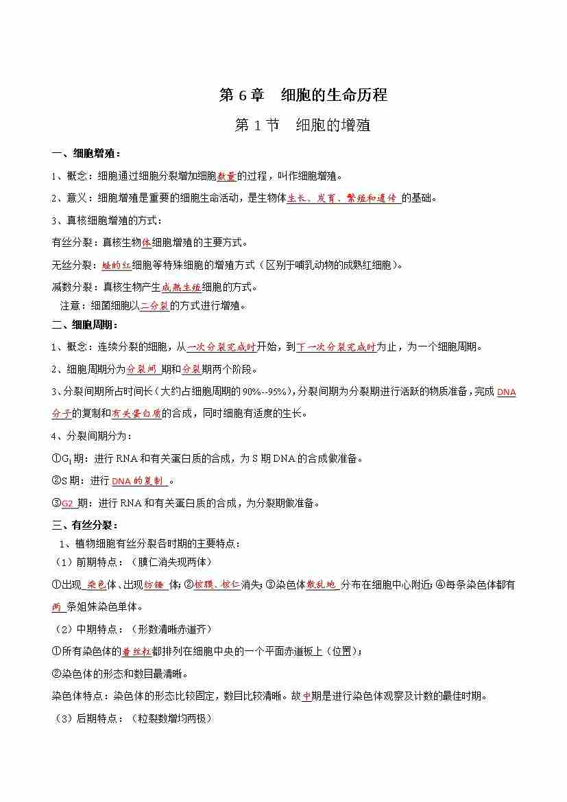 第6章 细胞的生命历程(单元知识清单)(填空版)