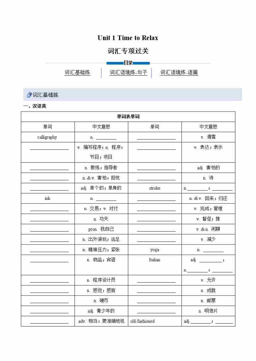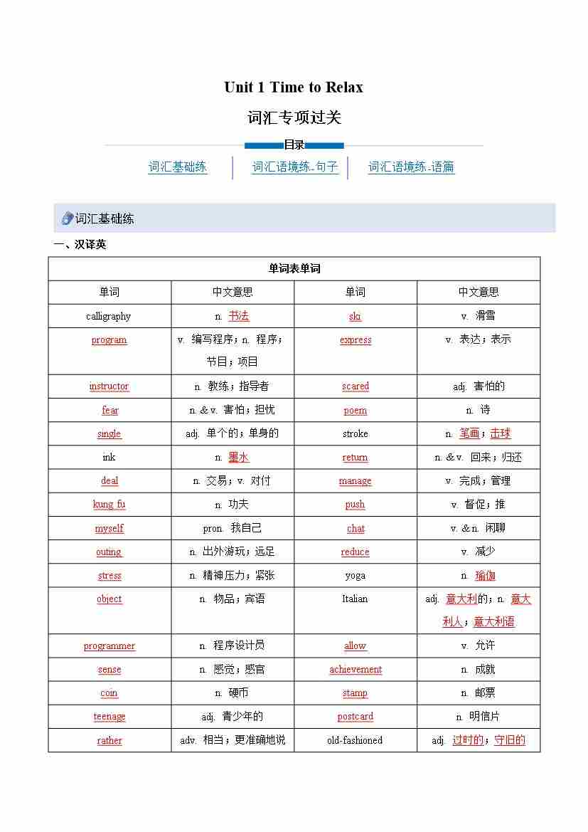 Unit 1 Time to Relax(重难词汇精练)(原卷版)