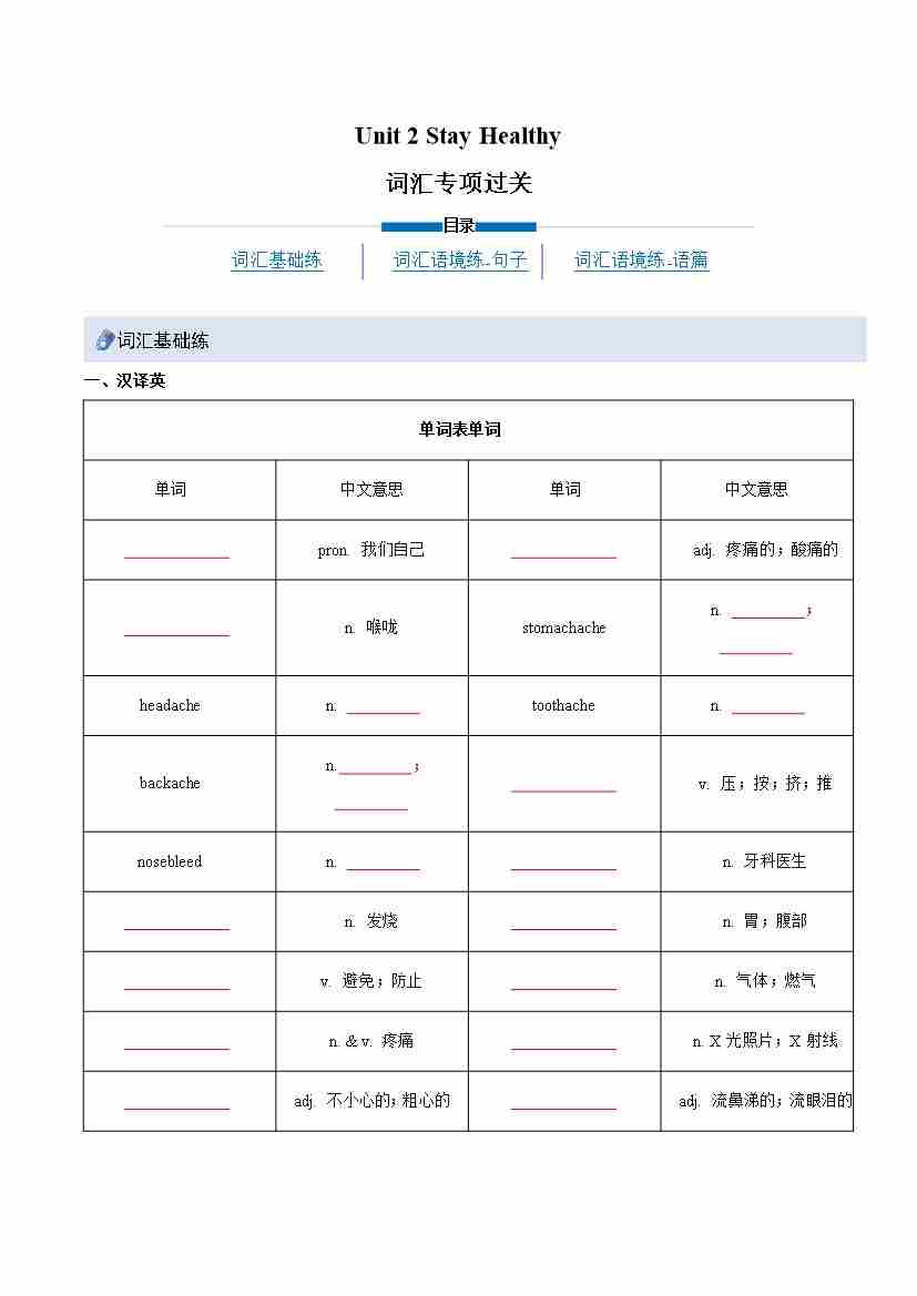 Unit 2 Stay Healthy (重难词汇精练)(原卷版)