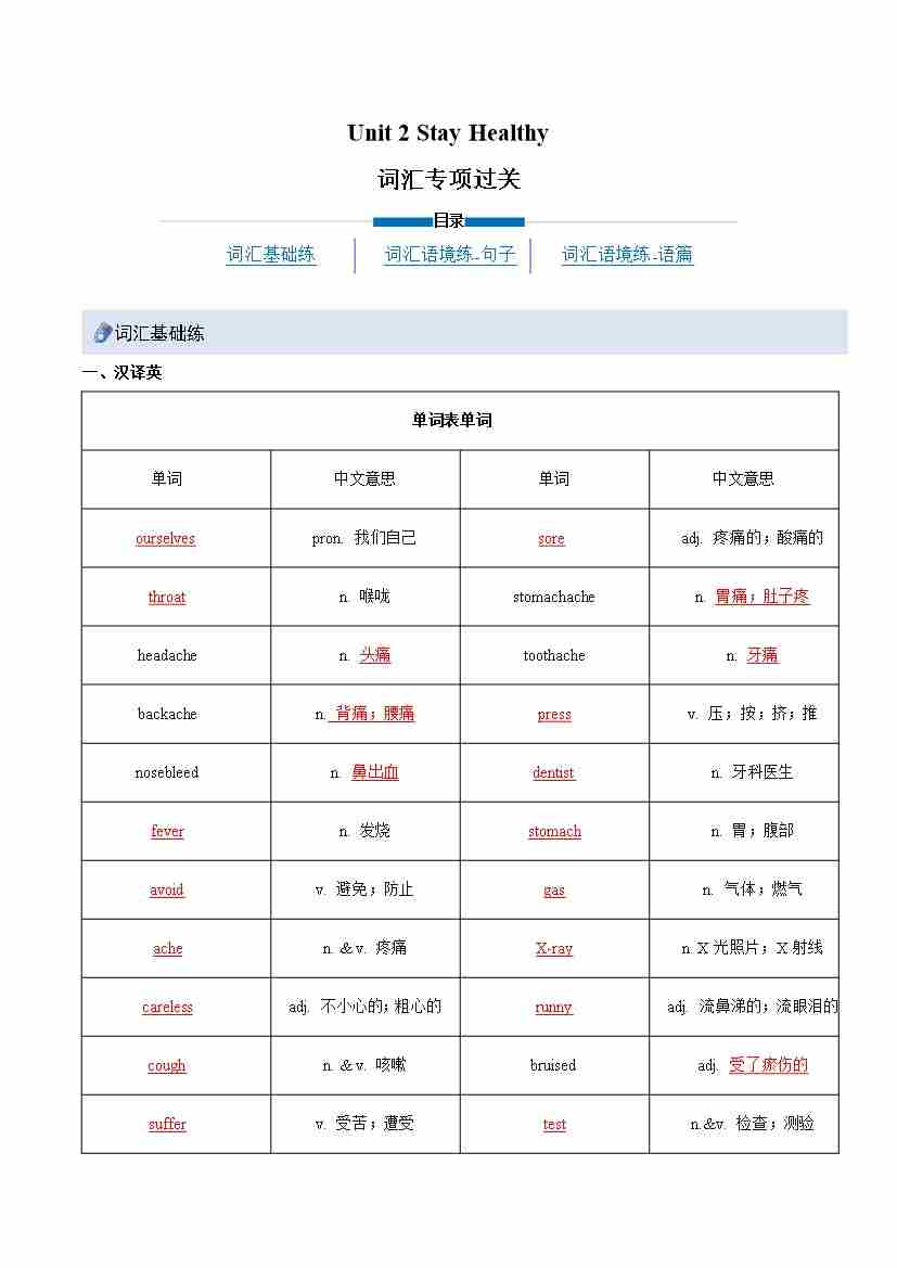 Unit 2 Stay Healthy (重难词汇精练)(解析版)