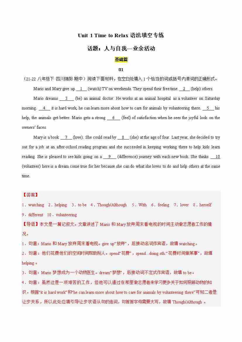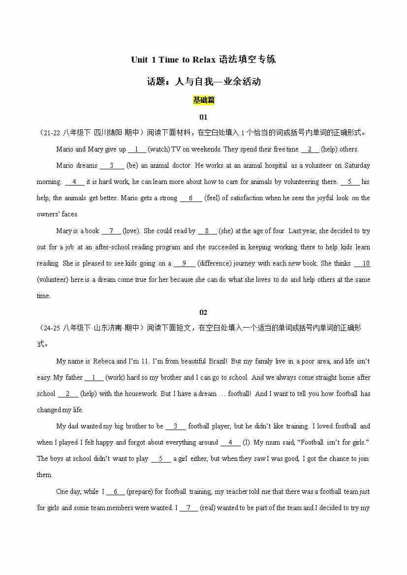 Unit 1 Time to Relax(语法填空专练)(解析版)