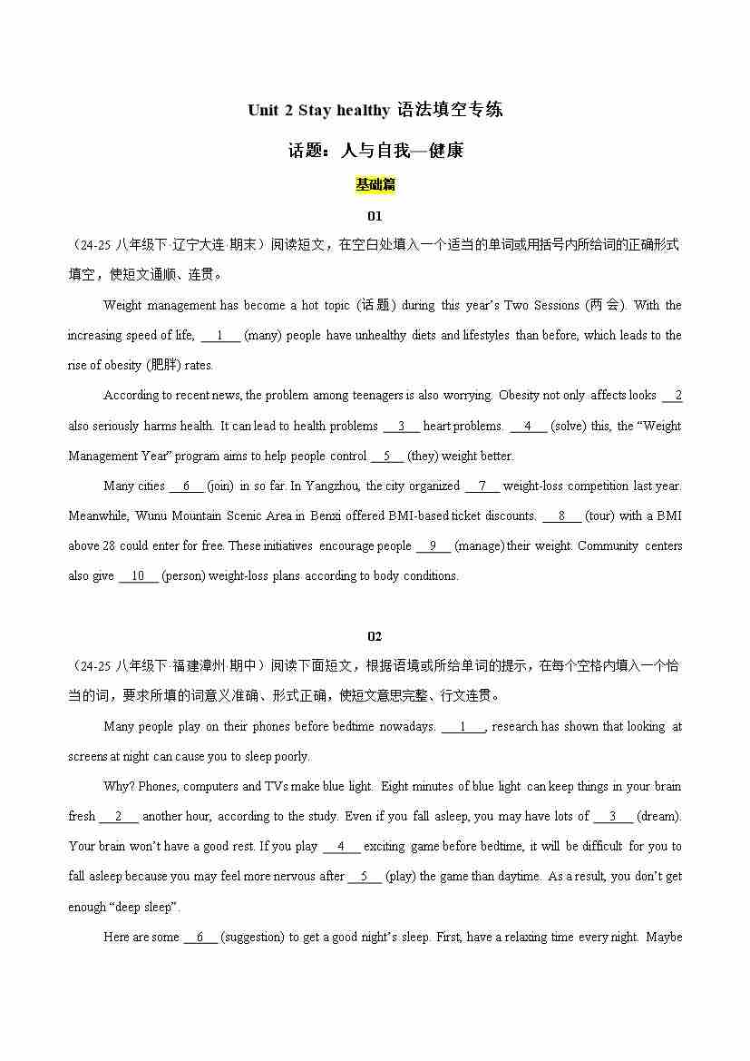 Unit 2 Stay healthy(语法填空专练)(原卷版)