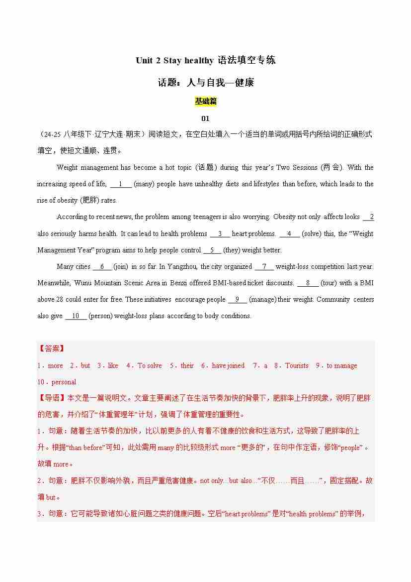Unit 2 Stay healthy(语法填空专练)(解析版)