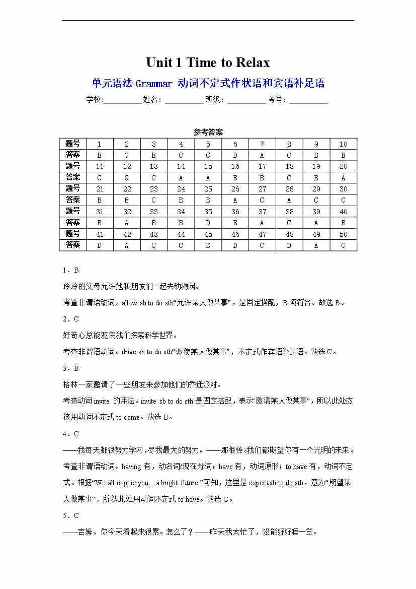 Unit 1 Time to Relax语法Grammar 动词不定式作状语和宾语 答案