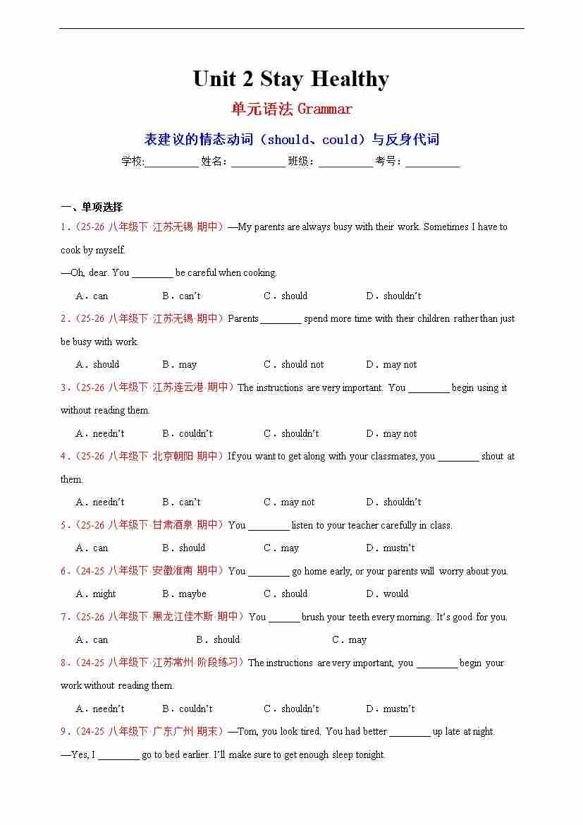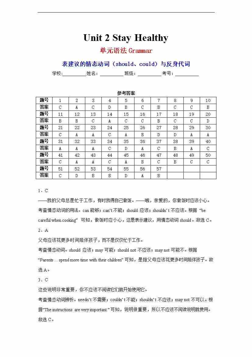 Unit 2 Stay Healthy单元语法Grammar表建议的情态动词(should、could)与反身代词 答案
