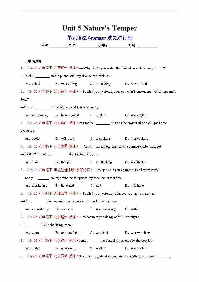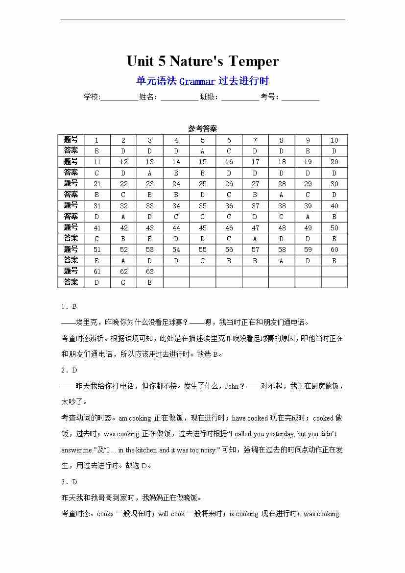 Unit 5 Nature's Temper单元语法Grammar过去进行时 答案