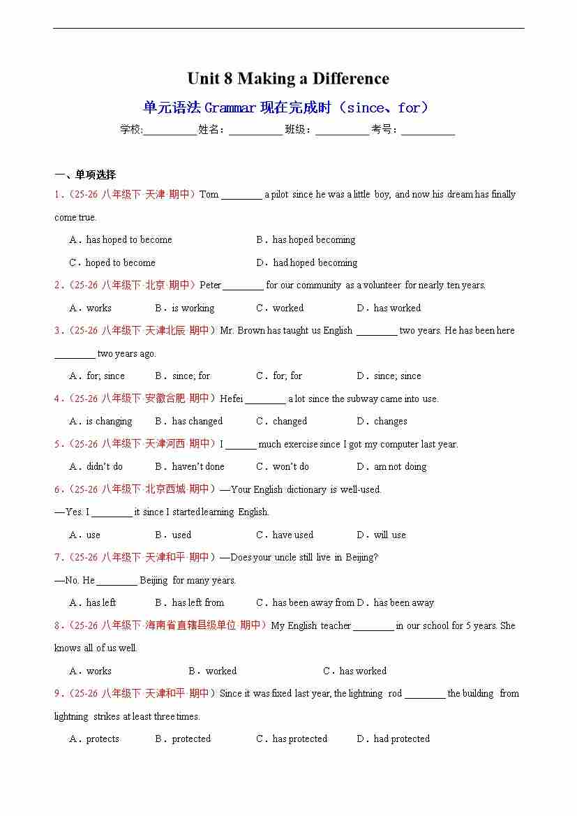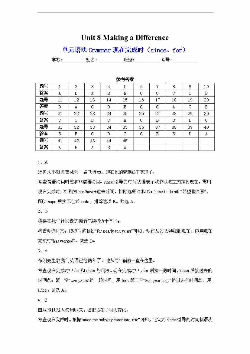 Unit 8 Making a Difference单元语法Grammar现在完成时(since、for) 答案