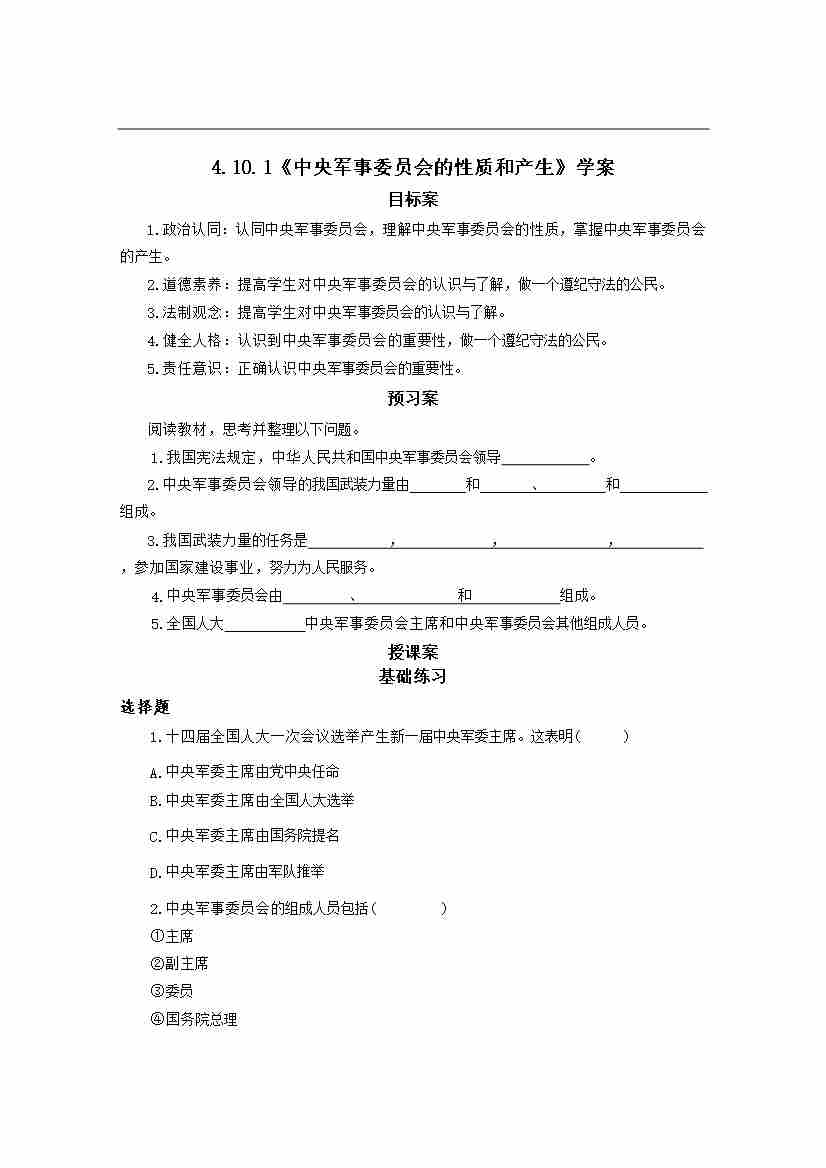 10.1 中央军事委员会的性质和产生 学案-2025-2026学年统编版道德与法治八年级下册