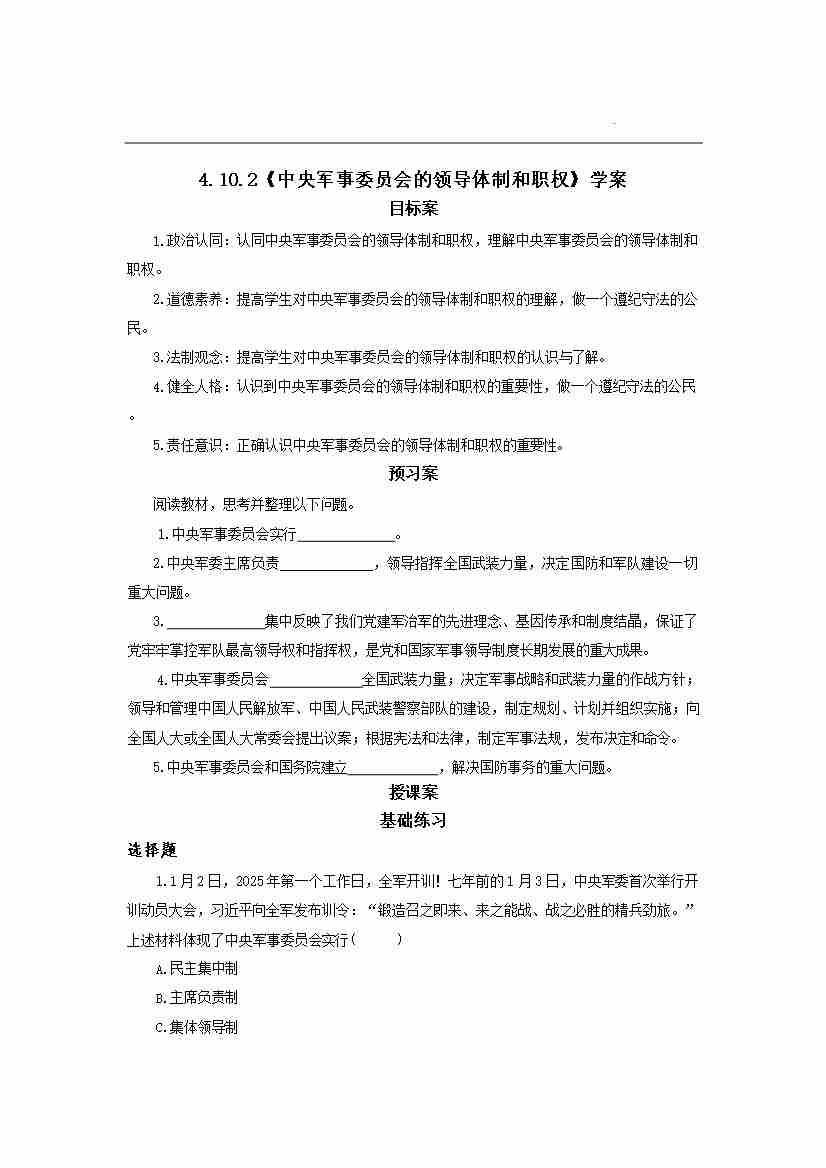10.2 中央军事委员会的领导体制和职权 学案-2025-2026学年统编版道德与法治八年级下册