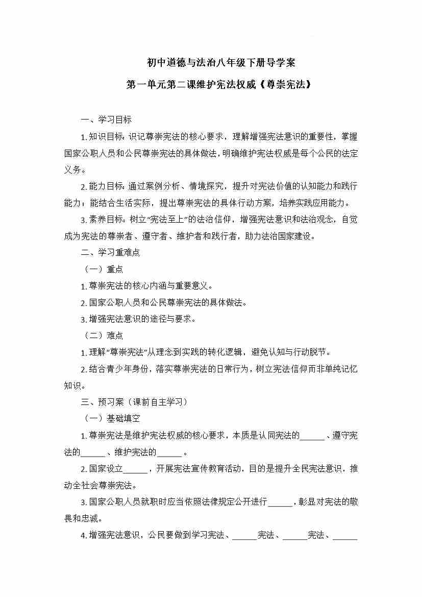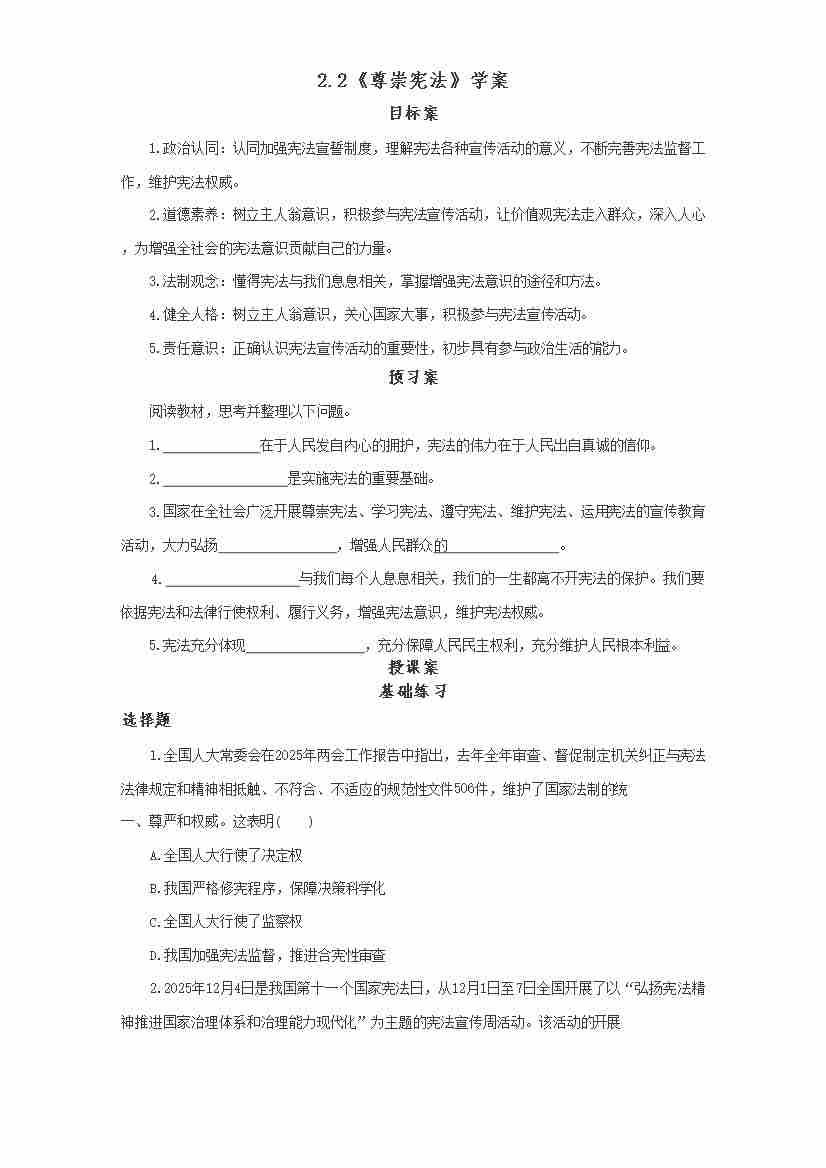 2.2 尊崇宪法 学案-2025-2026学年统编版道德与法治八年级下册
