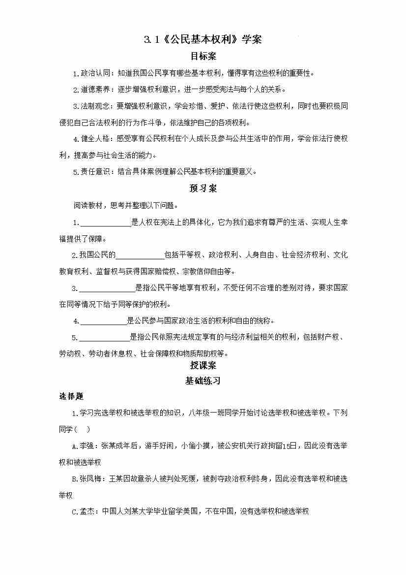 3.1 公民基本权利 学案- 2025-2026学年统编版道德与法治八年级下册