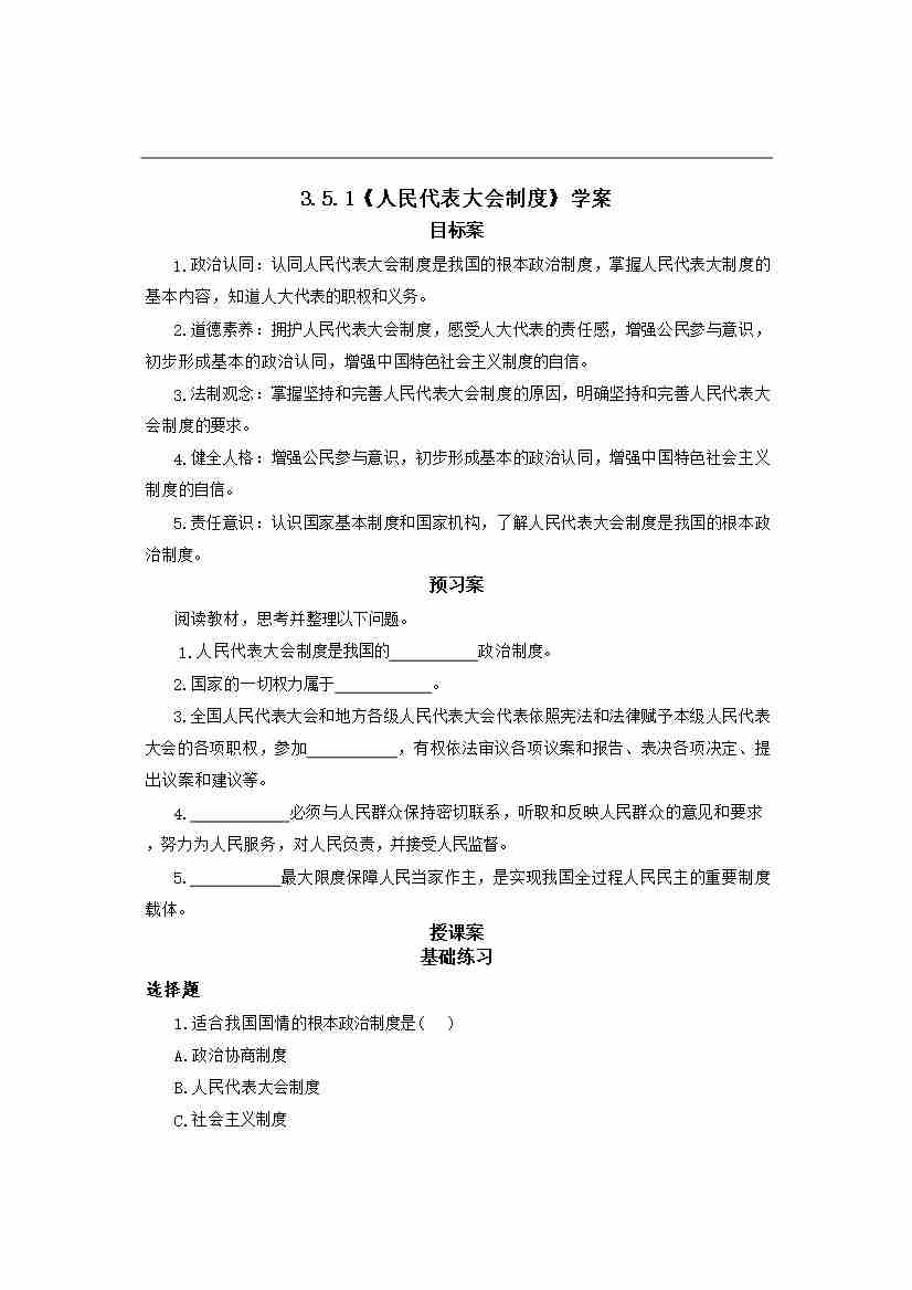 5.1 人民代表大会制度 学案-2025-2026学年统编版道德与法治八年级下册