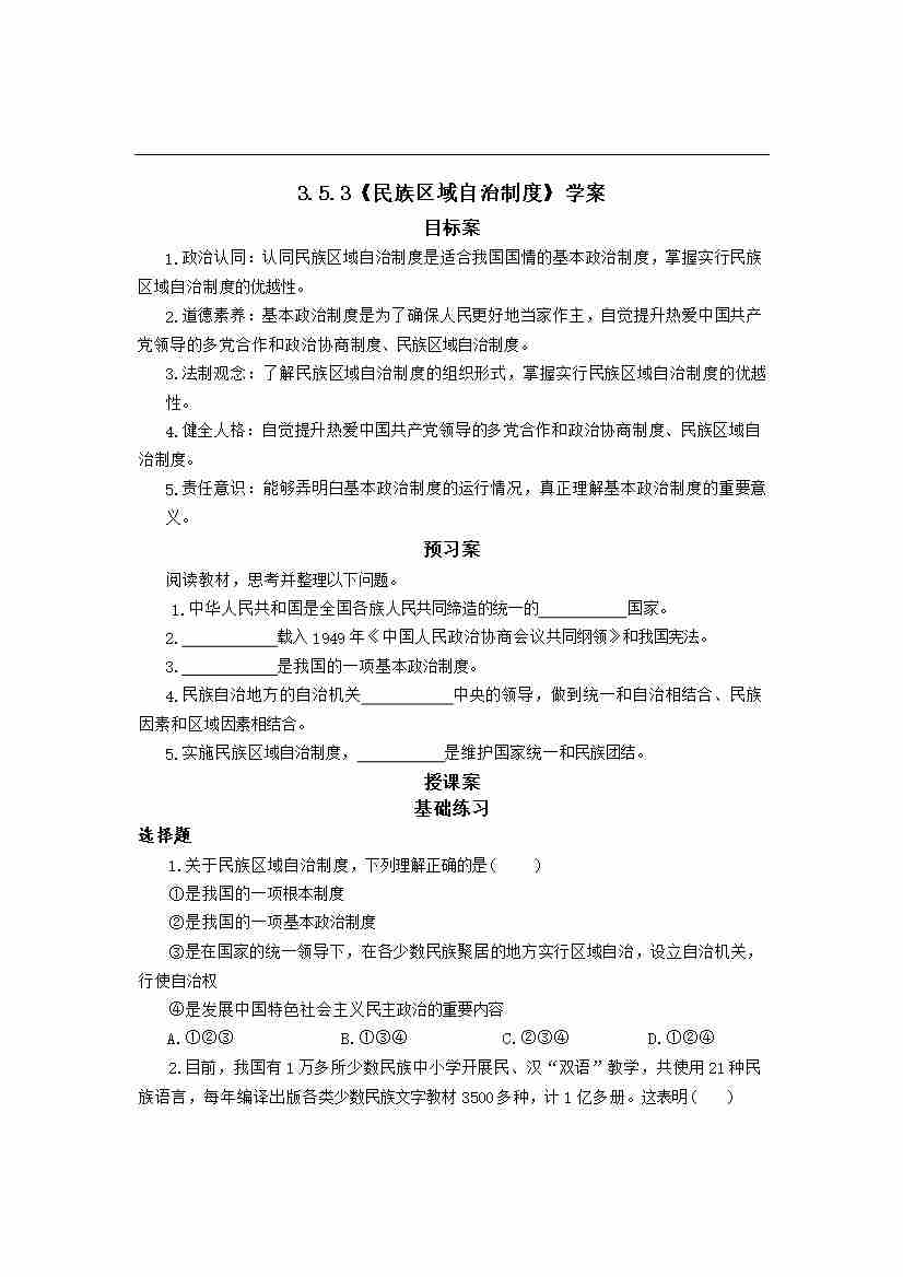 5.3 民族区域自治制度 学案- 2025-2026学年统编版道德与法治八年级下册