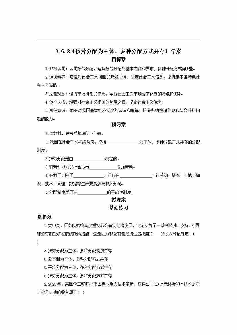6.2 按劳分配为主体、多种分配方式并存 导学案-2025-2026学年统编版道德与法治八年级下册