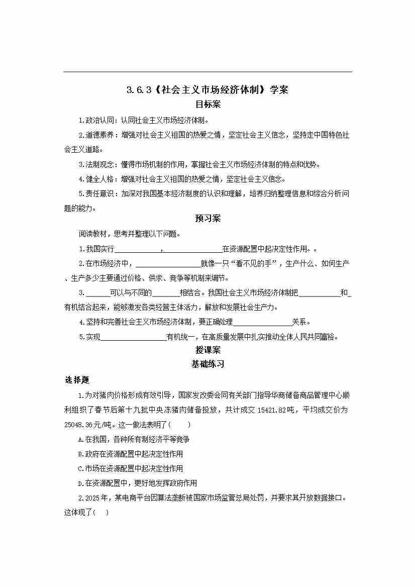 6.3 社会主义市场经济体制 导学案-2025-2026学年统编版道德与法治八年级下册