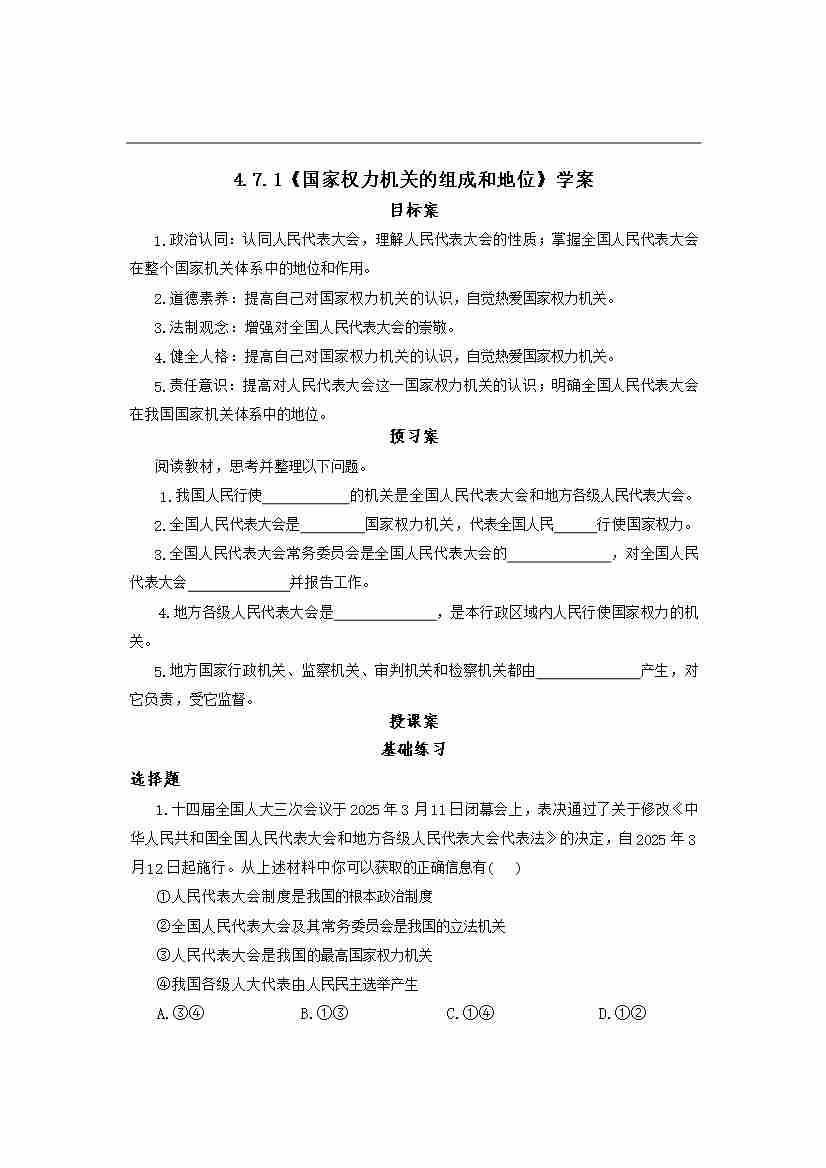 7.1 国家权力机关的组成和地位 导学案-2025-2026学年统编版道德与法治八年级下册
