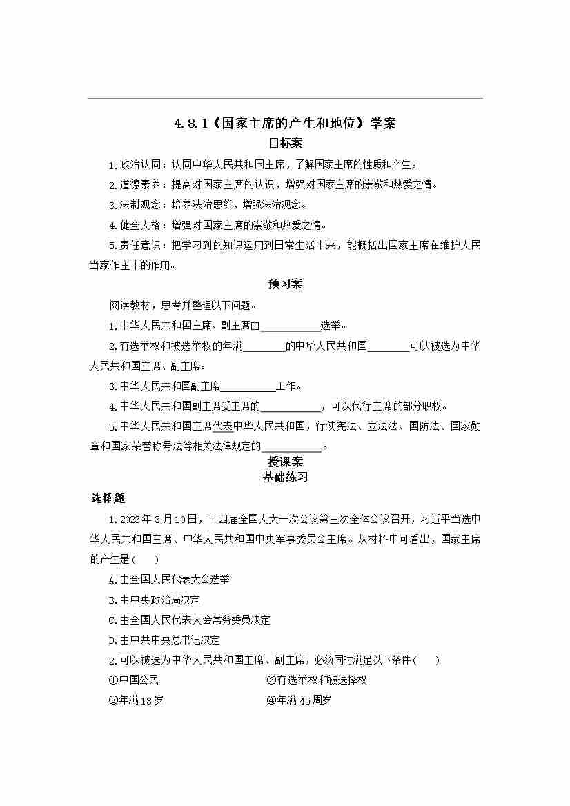 8.1 国家主席的产生和地位 导学案-2025-2026学年统编版道德与法治八年级下册