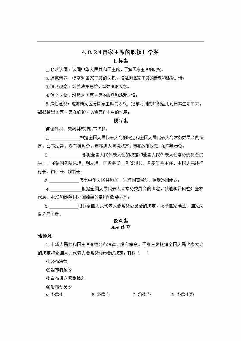 8.2 国家主席的职权 导学案-2025-2026学年统编版道德与法治八年级下册
