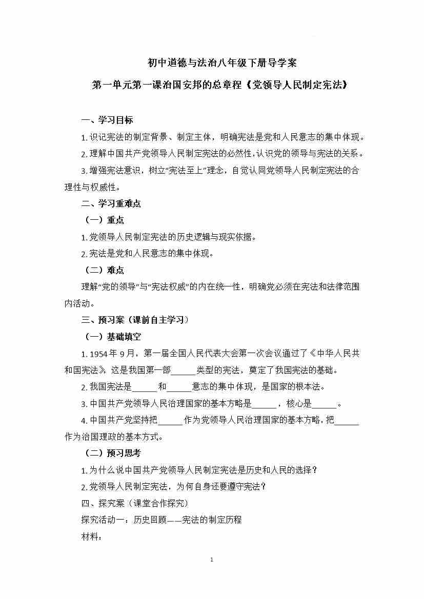1.1 党领导人民制定宪法 导学案-2025-2026学年统编版道德与法治八年级下册