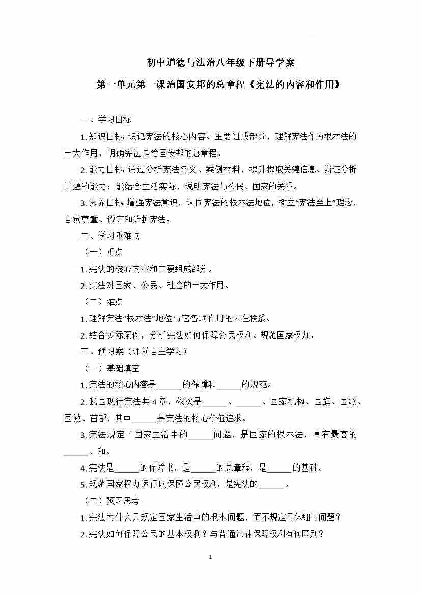 1.2 宪法的内容和作用 导学案-2025-2026学年统编版道德与法治八年级下册