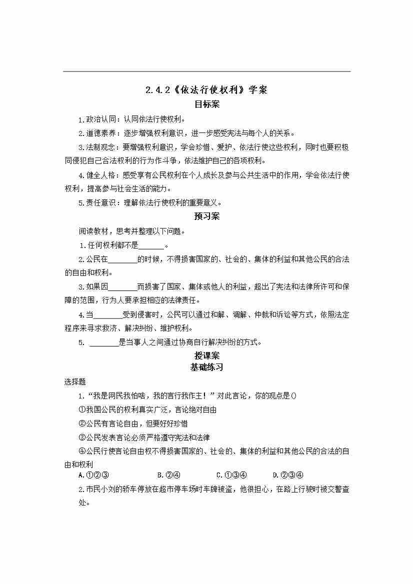4.2 依法行使权利 学案- 2025-2026学年统编版道德与法治八年级下册