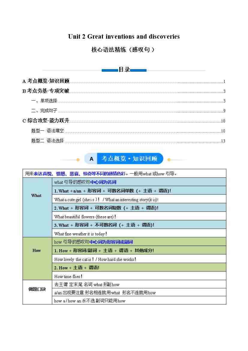 Unit 2 Great inventions and discoveries 感叹句(单元核心语法精练)(原卷版)