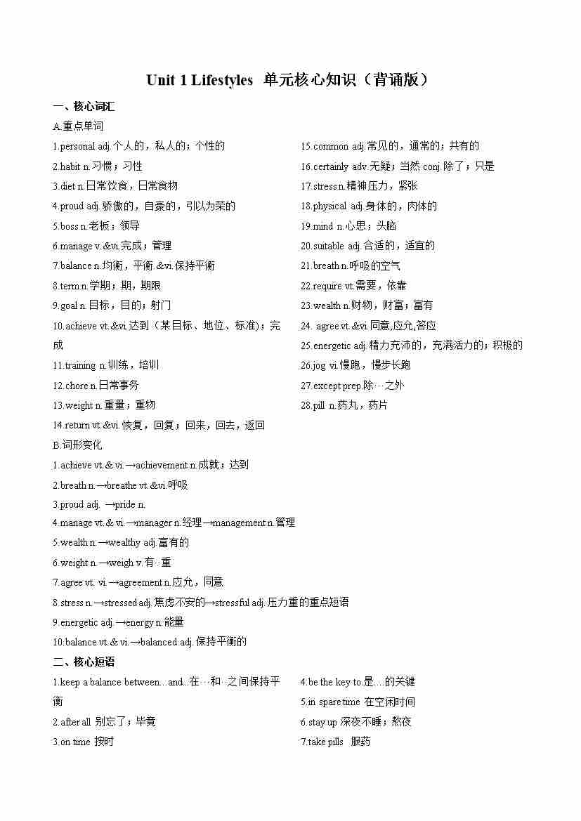 Unit1 Lifestyles 单元核心知识(背诵默写任务单)(背诵版)