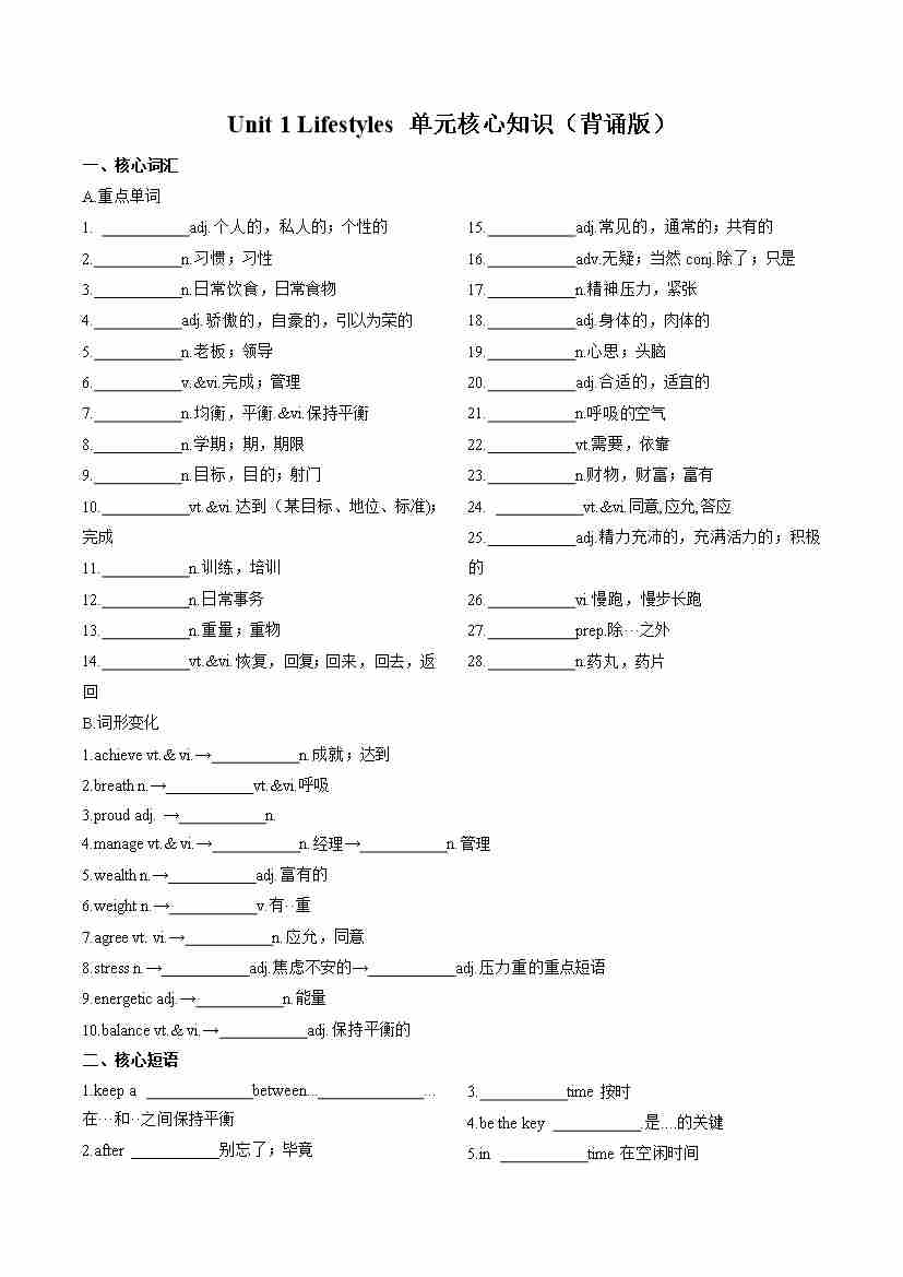 Unit1 Lifestyles 单元核心知识(背诵默写任务单)(默写版)