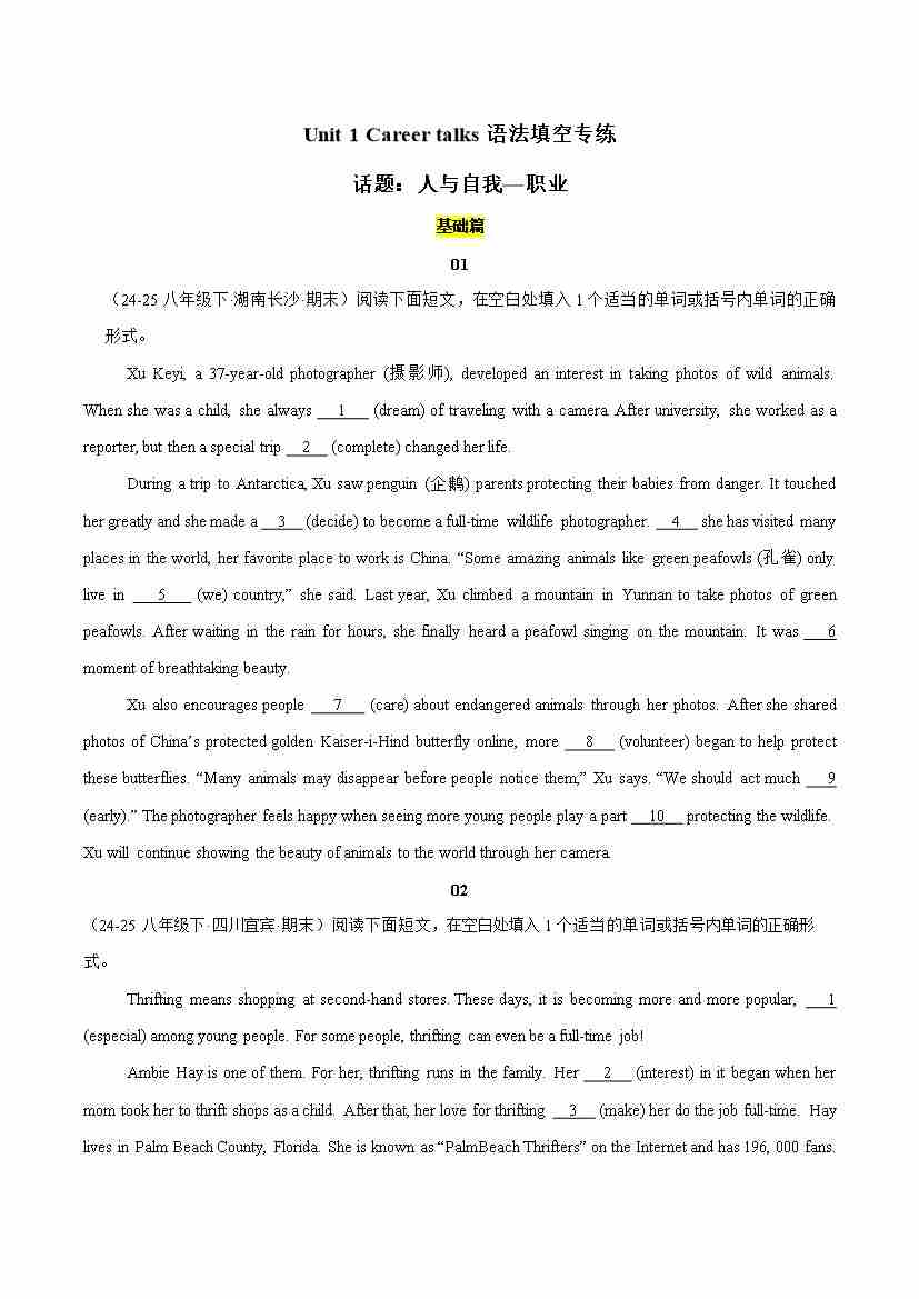 Unit 1 Career talks(语法填空专练)(原卷版)
