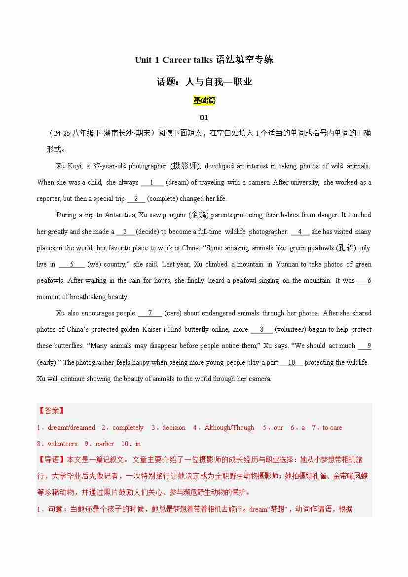 Unit 1 Career talks(语法填空专练)(解析版)