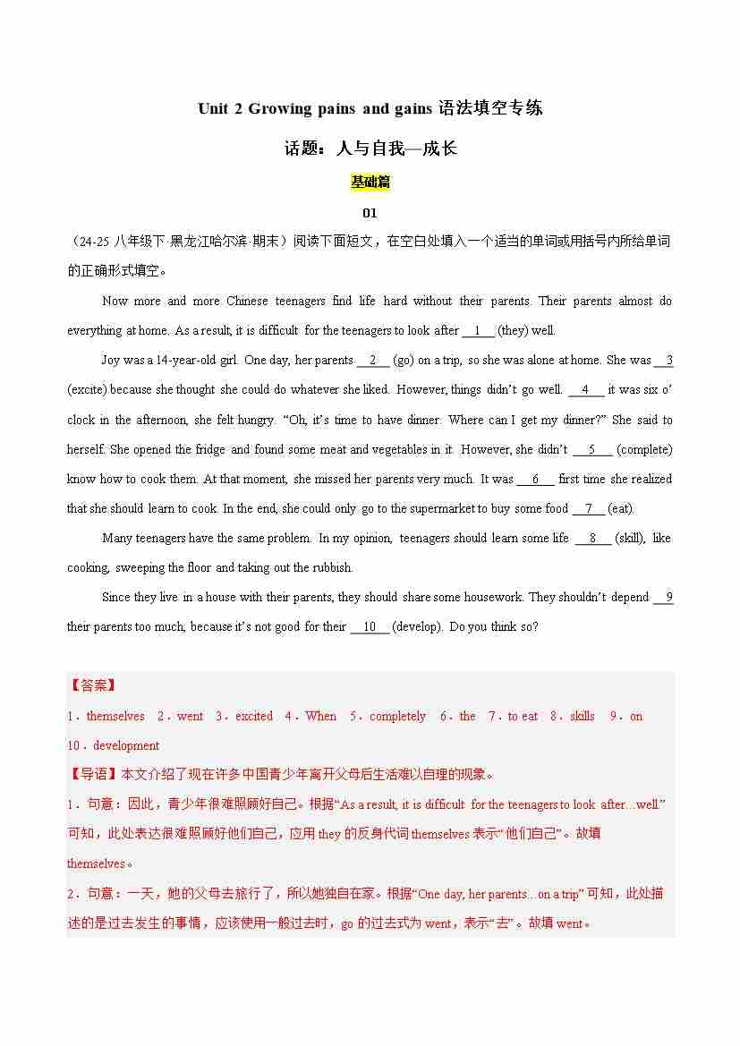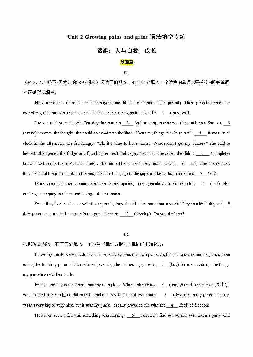 Unit 2 Growing pains and gains(语法填空专练)(解析版)
