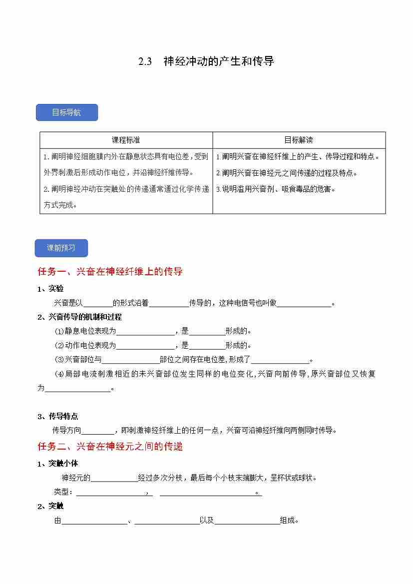 2.3 神经冲动的产生和传导(人教版选择性必修1)教师版