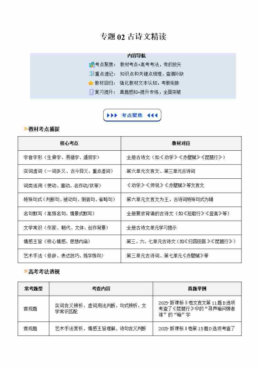 专题02 古诗文精读(寒假复习讲义)(学生版)