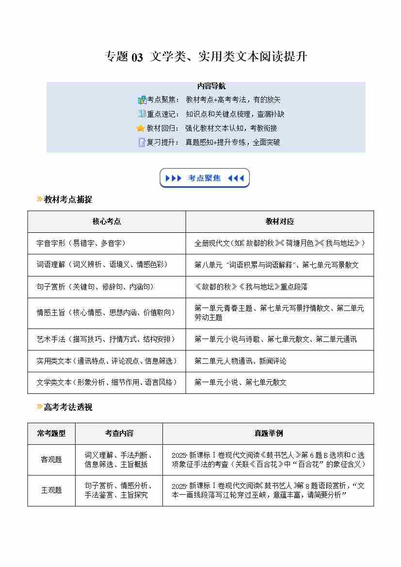 专题03 文学类、实用类文本阅读提升(寒假复习讲义)(教师版)