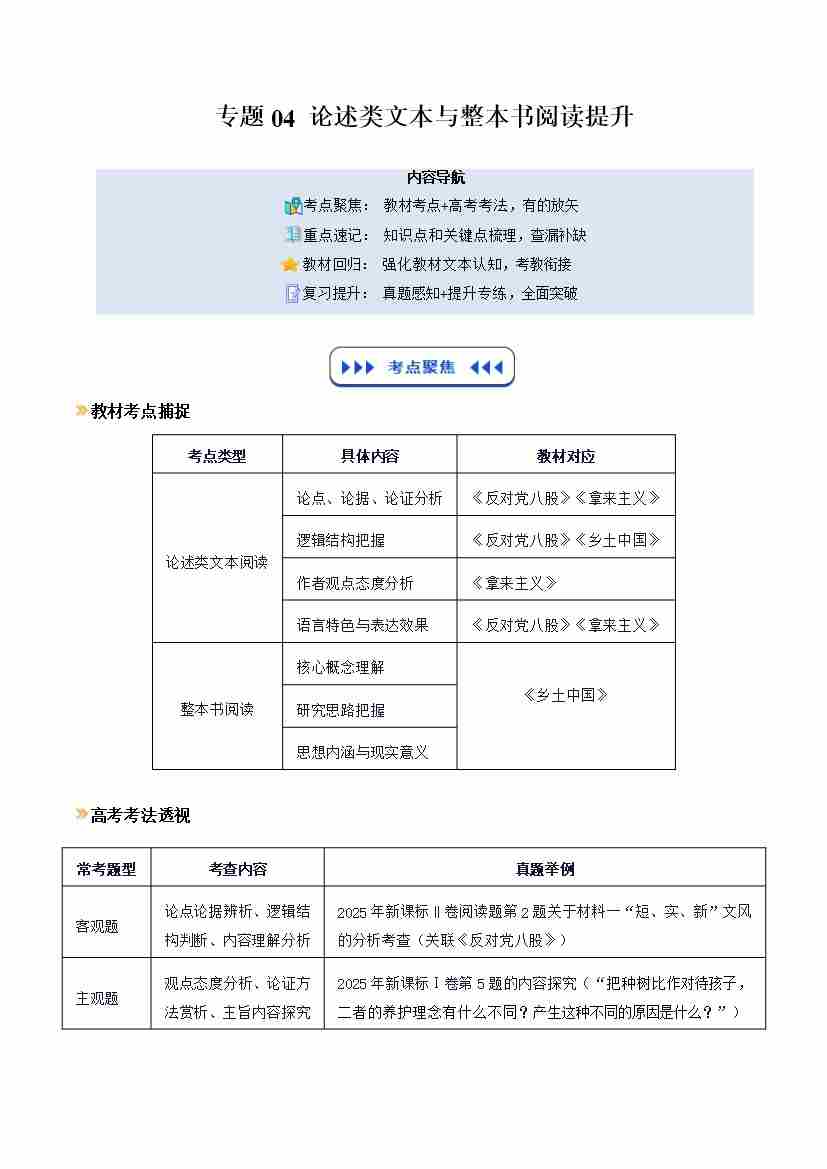 专题04 论述类文本与整本书阅读提升(寒假复习讲义)(学生版)