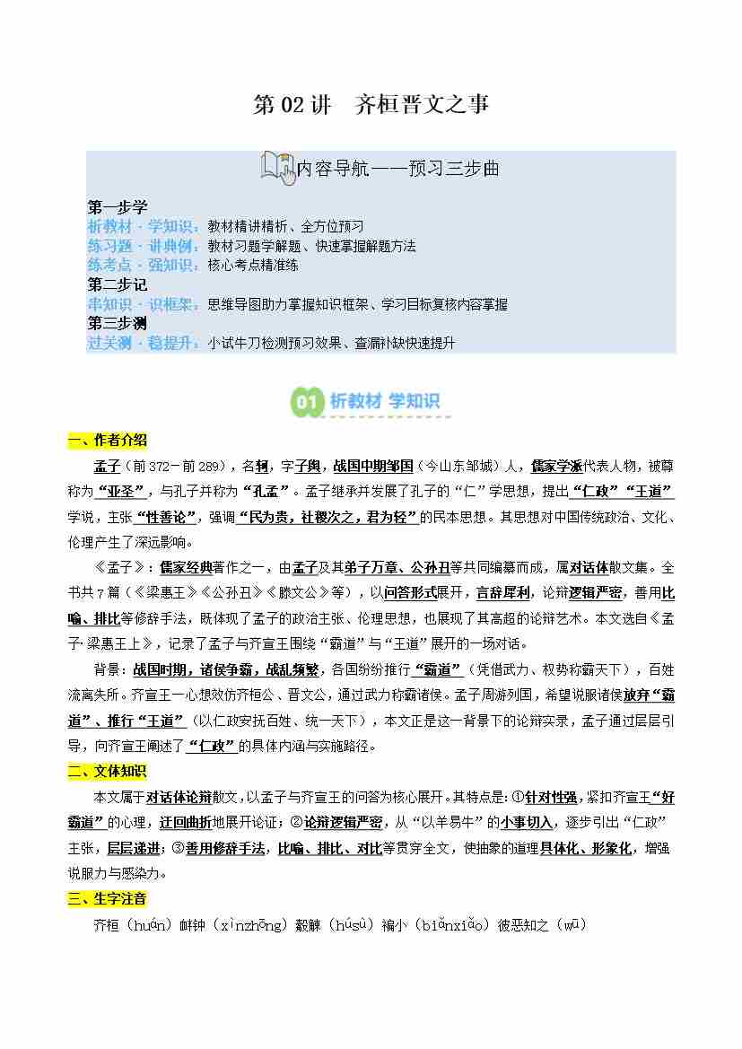 第02讲 齐桓晋文之事(寒假预习讲义)(学生版)