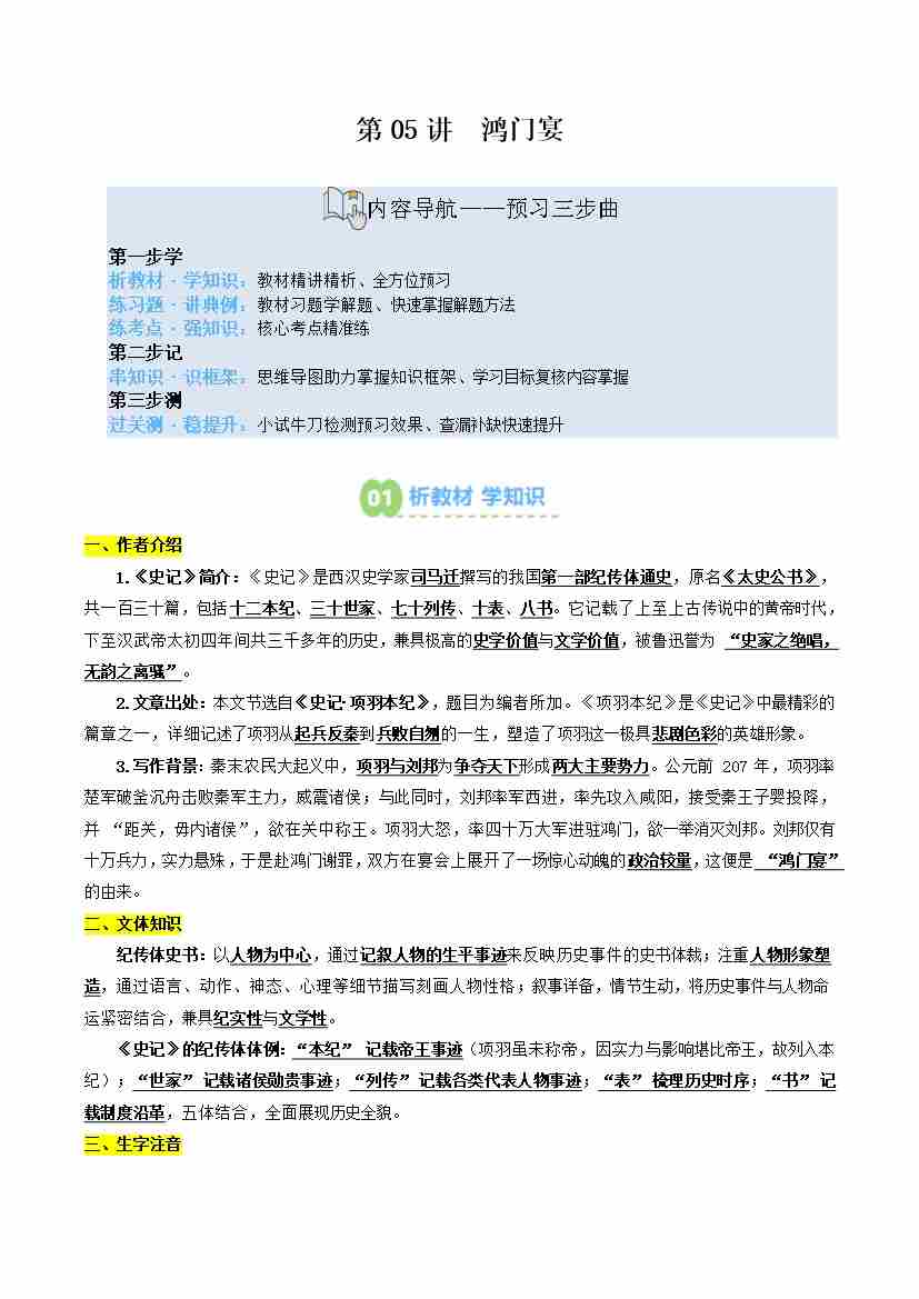 第05讲 鸿门宴(寒假预习讲义)(学生版)