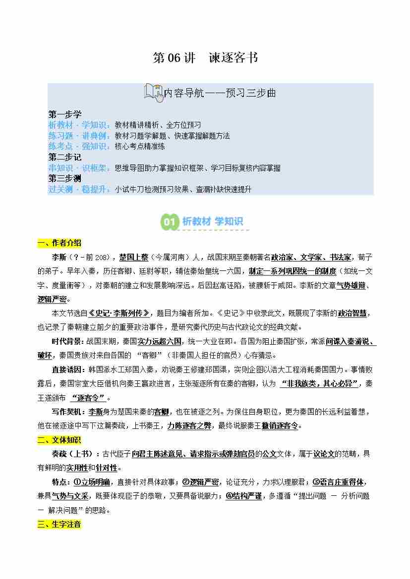第06讲 谏逐客书(寒假预习讲义)(学生版)