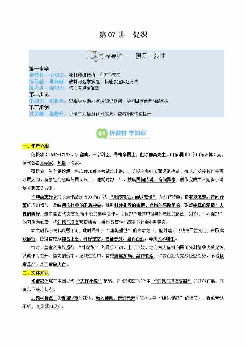 第07讲 促织(寒假预习讲义)(学生版)