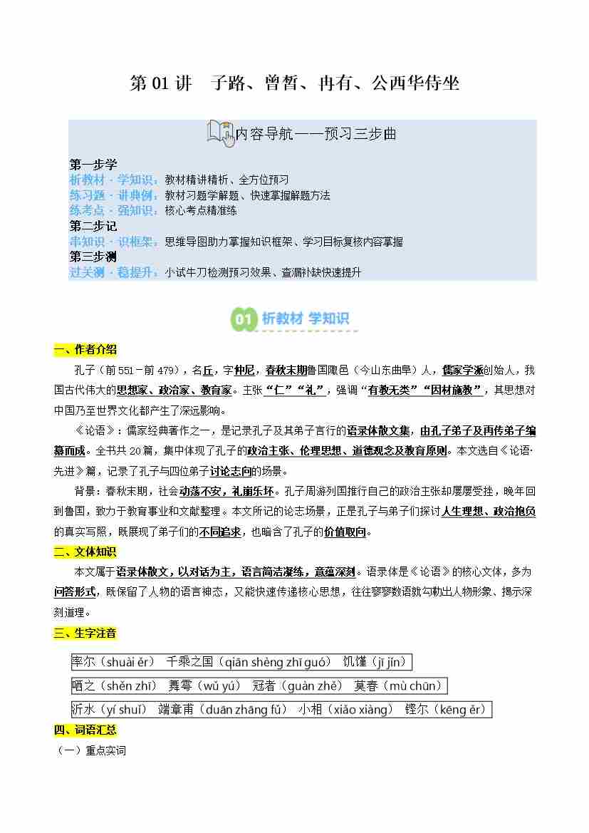 第01讲 子路、曾皙、冉有、公西华侍坐(寒假预习讲义)(教师版)