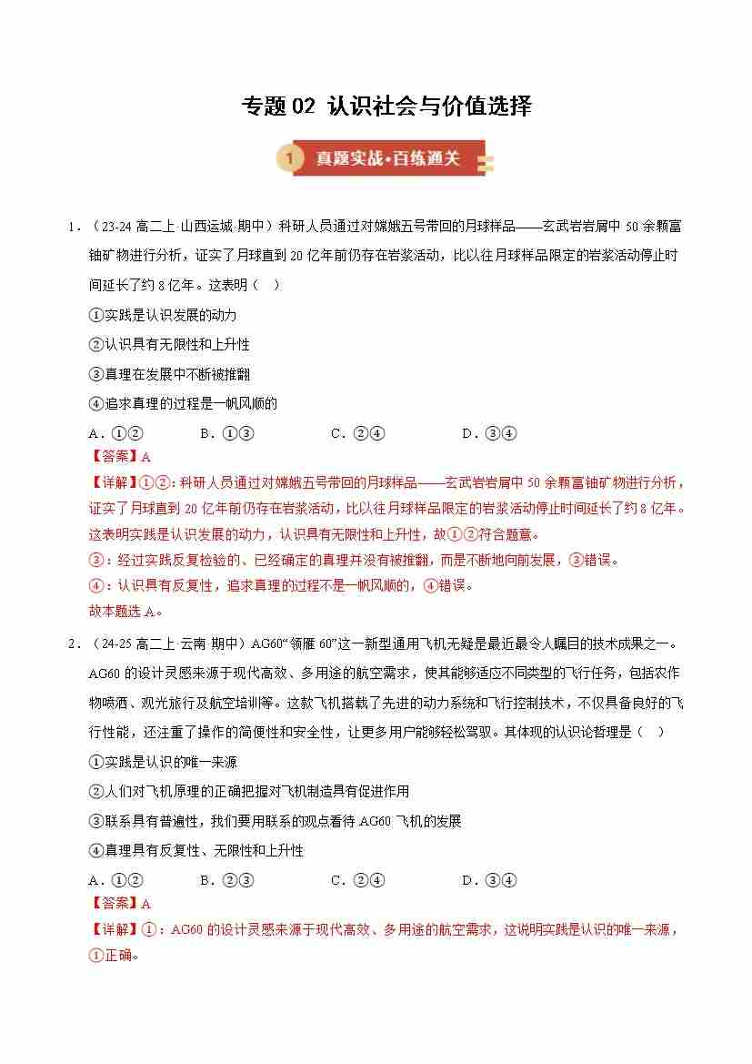 专题02 认识社会与价值选择(期中专项训练)(教师版)