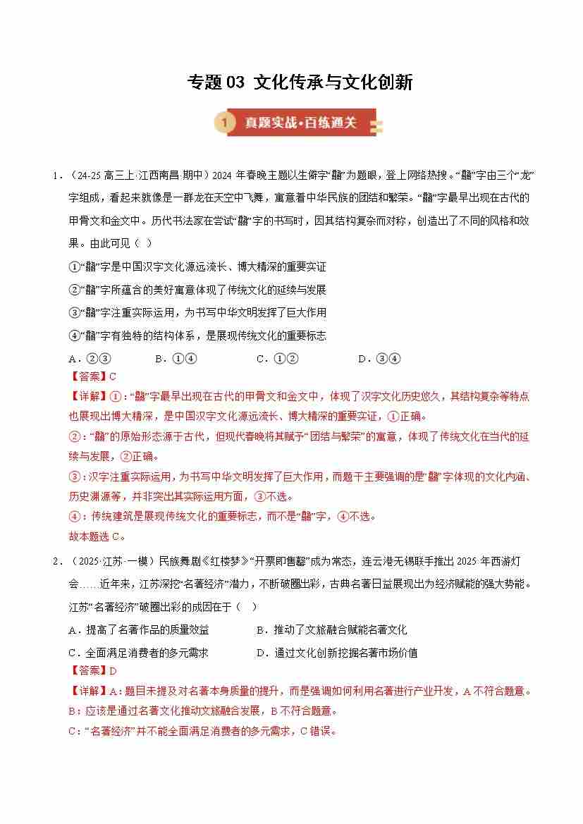 专题03 文化传承与文化创新(期中专项训练)(教师版)