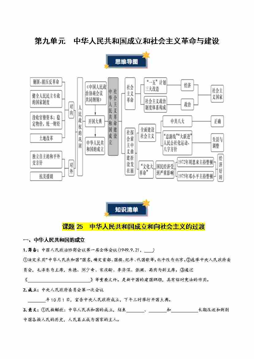 第九单元 中华人民共和国成立和社会主义革命与建设(知识清单)(挖空版)