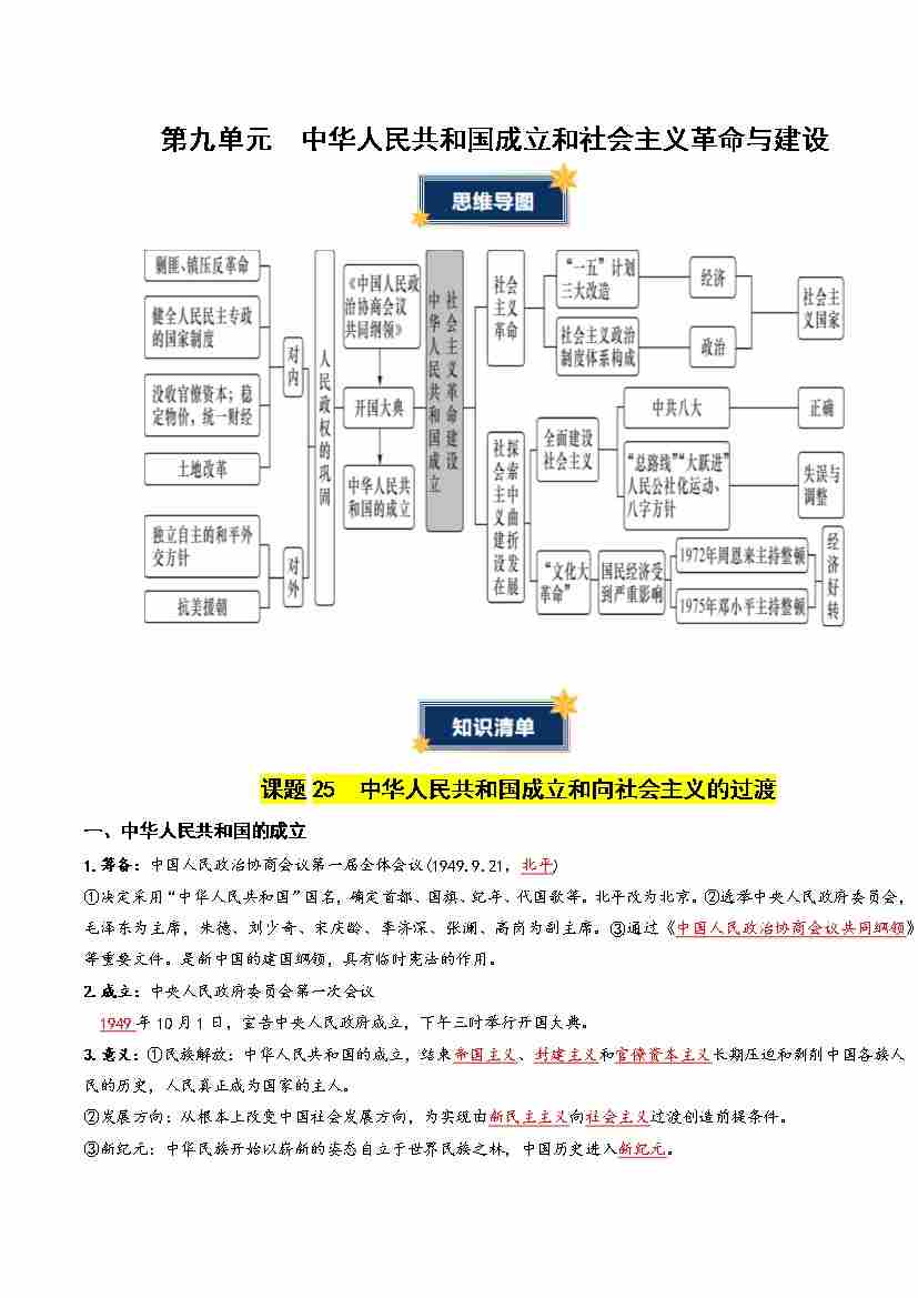 第九单元 中华人民共和国成立和社会主义革命与建设(知识清单)(答案版)