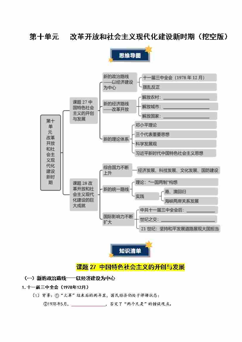 纲要上历史第十单元 改革开放和社会主义现代化建设新时期(知识清单)(挖空版)