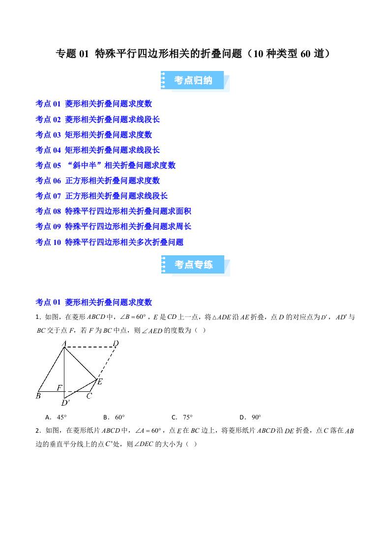 专题01 特殊平行四边形相关的折叠问题(10种类型60道)(原卷版)