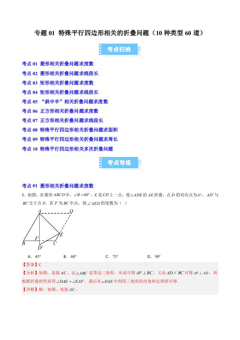 专题01 特殊平行四边形相关的折叠问题(10种类型60道)(解析版)
