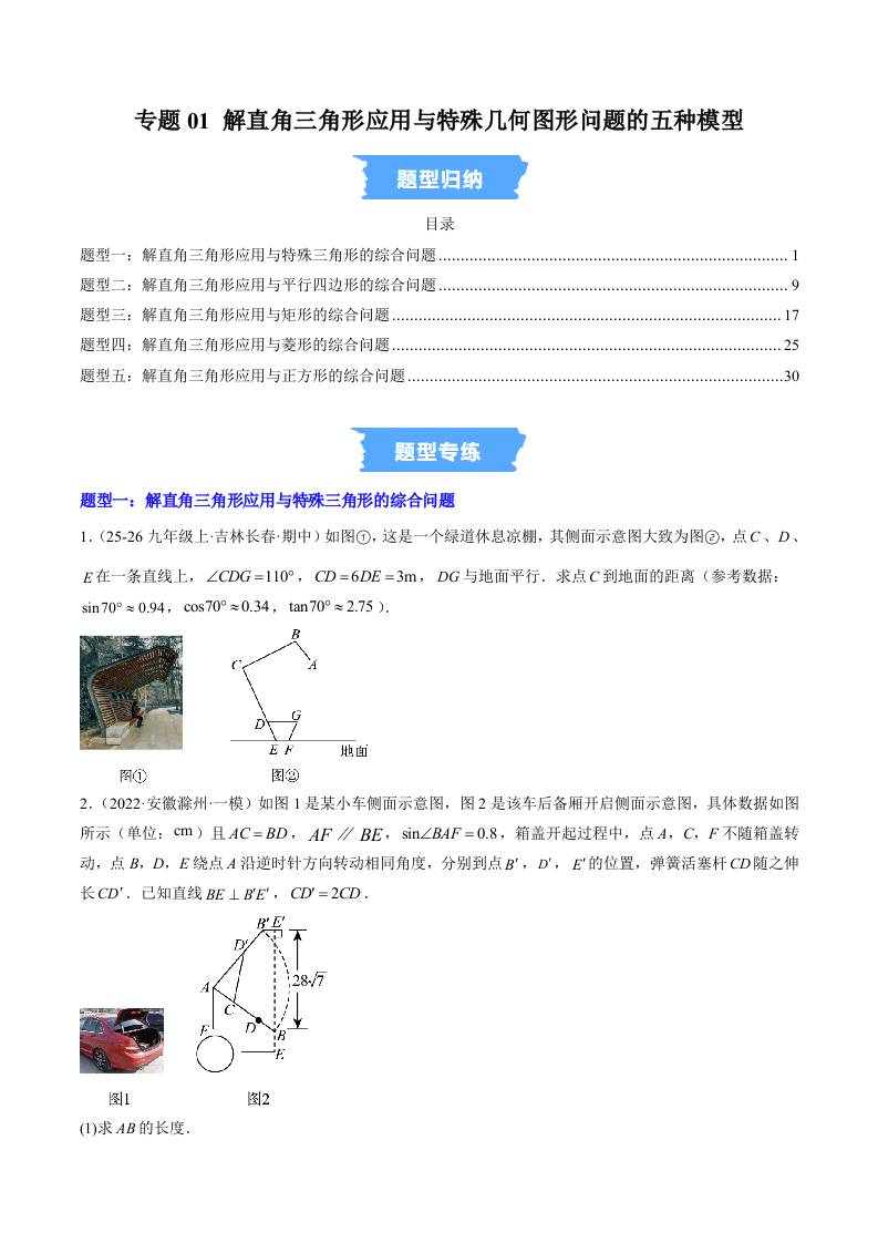 专题01 解直角三角形应用与特殊几何图形问题的五种模型(高效培优专项训练)(原卷版)